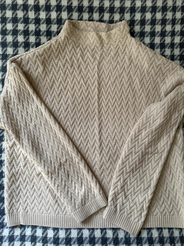 Светр бежевого кольору Горловина стойка Прямий крій Трохи спущений рукав Плечі 57 см Пів обхват грудей 59 см Довжина виробу 62 см Довжина рукава від горловини 73 см