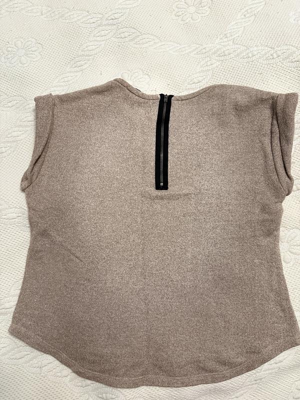 Интересный цвет, какой-то светло-коричневый с вкраплениями золотистого Сзади замочек 50 коттон, 42 вискоза и 8 металл Размер указан С, также отлично подойдет на ХС или М Длина 57 Подмышки 52 Плечи 47 Почти не заметен дефект на последнем фото