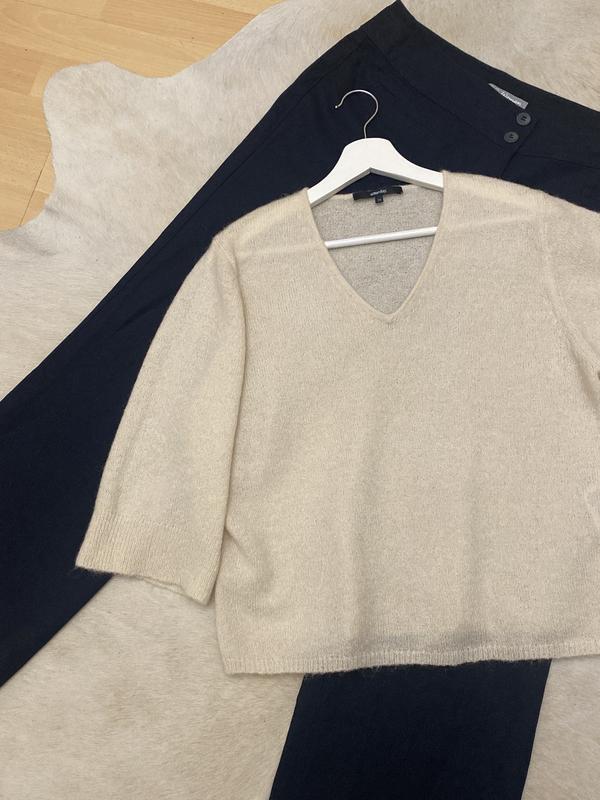 Стильный бежевый джемпер с v-вырезом горловины из тонкой натуральной пряжи. Оверсайз. Широкие рукава 3/4 длины. Состояние новой вещи. Пог 50 см. Ширина в плечах 42 см. Р 40 см. Д 54 см.