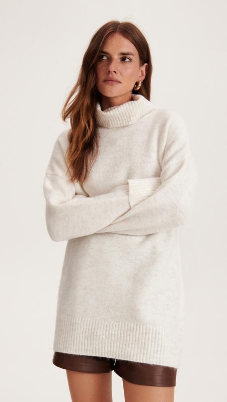 Джемпер вільного крою з мʼякого трикотажу Reserved. Виріз горловини з гольфом, знижена лінія плечей. Розмір M. Гарно дивиться з поясом під джинси скіні чи легінси.