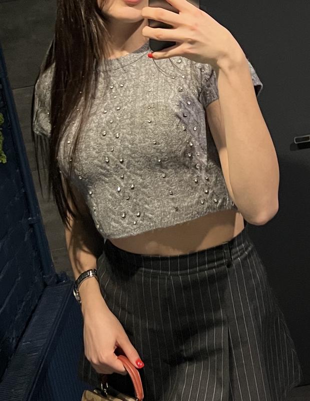 Мега стильний топ з коротким рукавом, тепленький. На S підійде. Стрази добре прикріплені. Є нюанс на останньому фото, відпав один камінчик, при носці не помітно. Можна приклеїти туди схожий