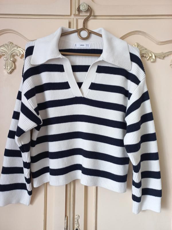 Стильный полосатый джемпер поло, размер XS, оверсайз, Пог 48см, плечи 52см, рукав от шеи 66см, длина 49см. состав:48% вискоза, 28% полиэстер,24% полиамид, дует классный, новый без бумажной бирки.