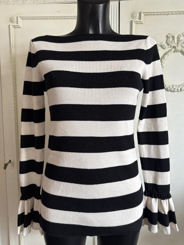 Стильный джемпер с интересным рукавом от Lauren Ralph Lauren. Широкая полоска бело-черная. Состав: хлопок/модал/нейлон(52/32/17). Размер по набору-М. Замеры: длина-63 см, ПОГ-39 см, ПОБ-39 см, рукав-63 см