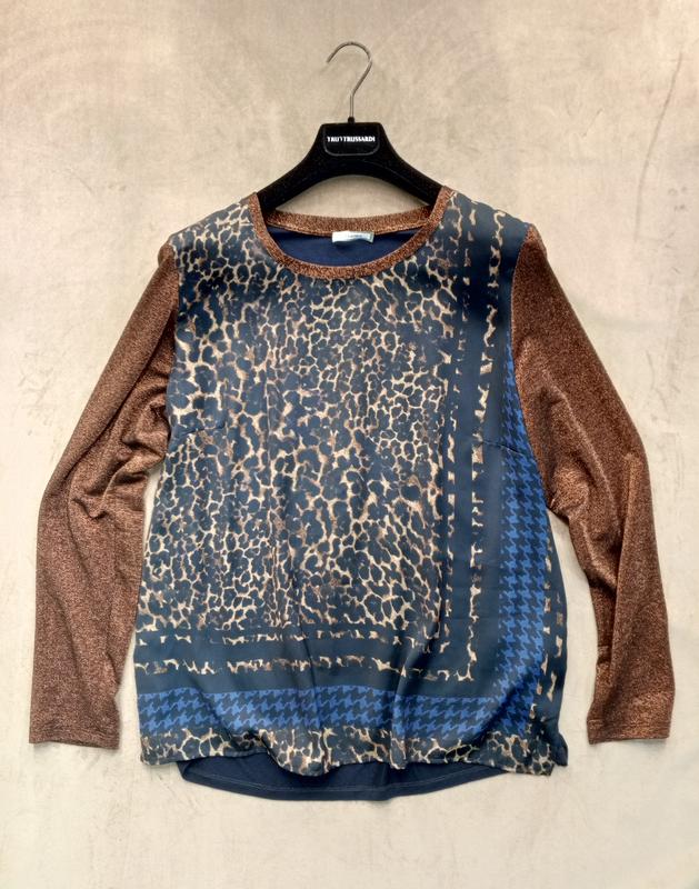 Size : M (об'ємна модель, на 46/48 It). Стан прекрасний, рукав люрикс, нг приємний. Має вигляд як блуза. Гарне поєднання кольорів. - під руками 58*2 - талія 57*2 - довжина виробу 62 - рукав 64 - по плечах 41 см
