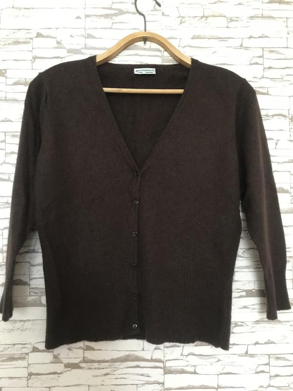 Стан дуже хороший Є маленька дірочка на рукаві, яку легко зашити зі зворотної сторони, думаю, що помітно зовсім не буде Колір рівний темно-коричневий шоколадний Склад 40% ангори 40% вовна 20% нейлон Довжина 60 НОГ 50 потягнеться при потребі 55 Рукав 3/4 довжина рукава 49 Манжети рукавів та низ не розтягнуті Чиста, без запахів