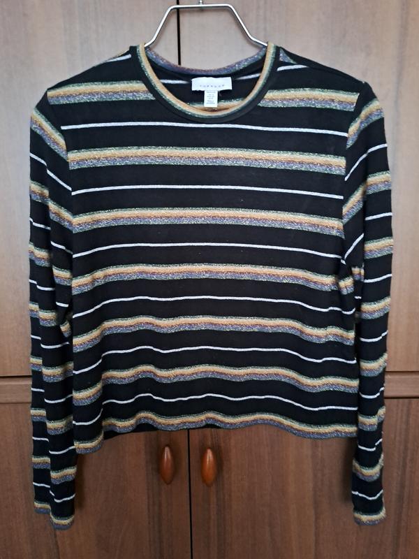 Джемпер с разноцветными полосками. В основной материал добавлен небольшой процент люрекса, что придает сдержанным цветам свежесть. Трикотаж эластичный, тонкий. 87% вискоза, 5% полиэстер, 4% люрекс, 4% эластан. Размер от производителя- 40. Пог.- 49, длина- 50, длина рукава- 60 см.