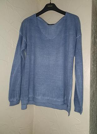 джемпер блідо- голубий, принт нерівномірний окрас, прямий крій, довгий рукав, по боках розрізи, перед трохи коротший, розмір 46 груди 55см, довжина 62/65см, довжина рукава 50см +21см опущене плече, 30% вовни, 70% акрил