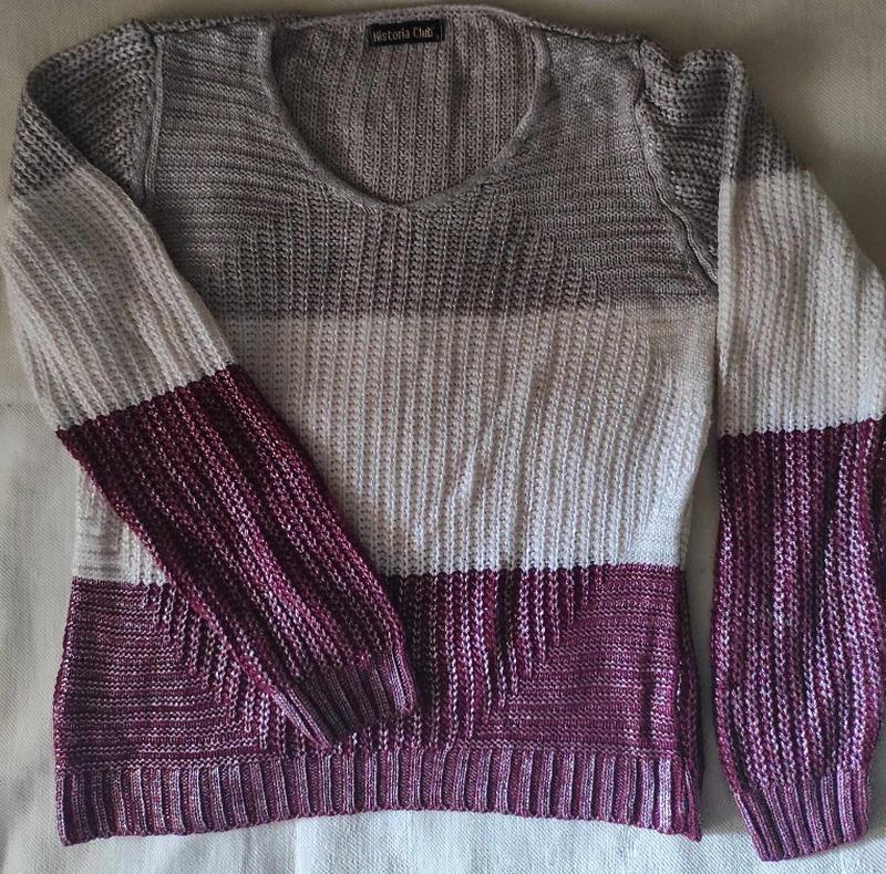 В'язаний джемпер, акрил, трьох кольорів, м'який і легкий. З сріблястим напиленням, добре тягнеться. Підійде на р.48, довжина - 60см, ширина під грудьми - 52см, довжина рукава - 65см.