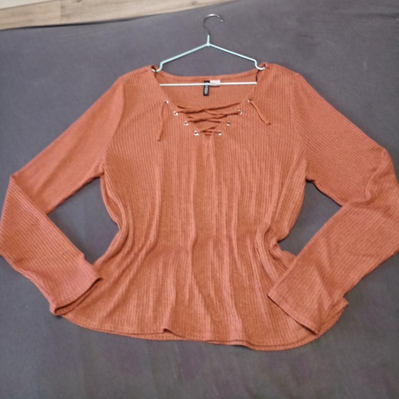 Кофточка топ блузка трендовая кирпического с завязками на груди H&M с рукавами, привычайно приятная к телу, в рубчик. Стан новоі. Камбоджи.Вельная. Грудь до 55см Талия 53см Стегна см Длина 60см Рукав 65см