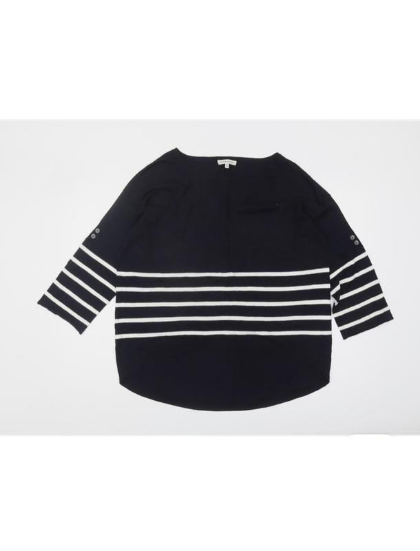 Жіночий джемпер в смужку Laura Ashley. Склад: 50% Cotton, 50% Modal. З рукавом 3/4, що підгортається і фіксується на гудзиках. Напів обхват грудей 56 см, довжина спереду 56 см, по спинці 70 см. На останньому фото на білій смужці маленька пляма, непомітна, якщо про неї не знати.