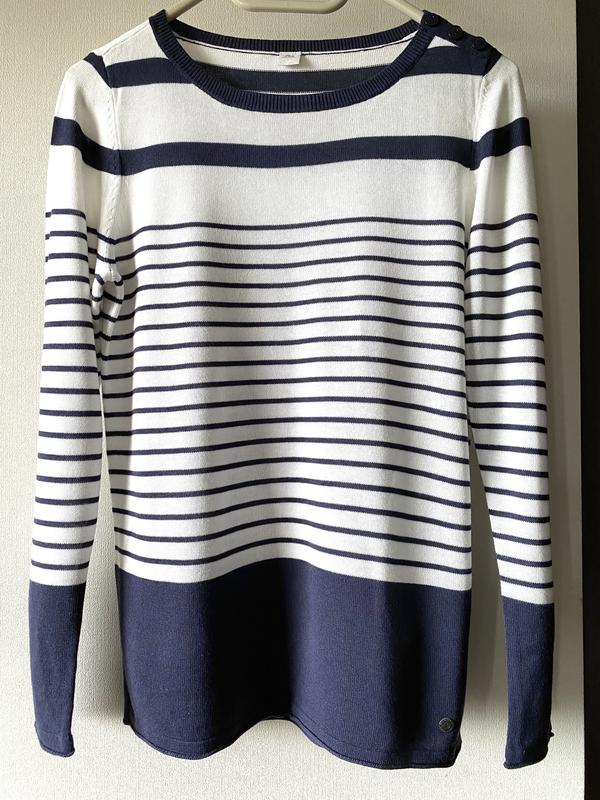 Тоненький в’язаний джемпер в смужку з віскози. Низ рукавів та одне плече прикрашені ґудзиками Тягнеться Напівоб’єм грудей 46 Напівоб’єм талії 43 Напівоб’єм стегон 44 Довжина вироба 63 Довжина рукава 62 Плечі 34
