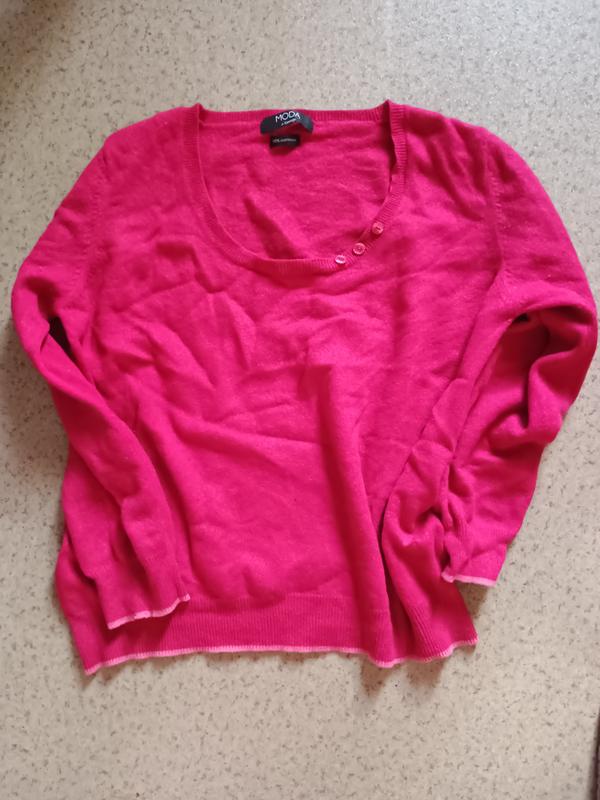 кашемир 100%! пог-50, дальше ровно, длина - 53, плечи- 37, рукав-49, цвет реально малиновый, состояние отличный, единственный недостаток-маленькая дырочка, минимальная сумма для оформления заказа 100 грн. в целом - не растягивающий, цвет яркий.