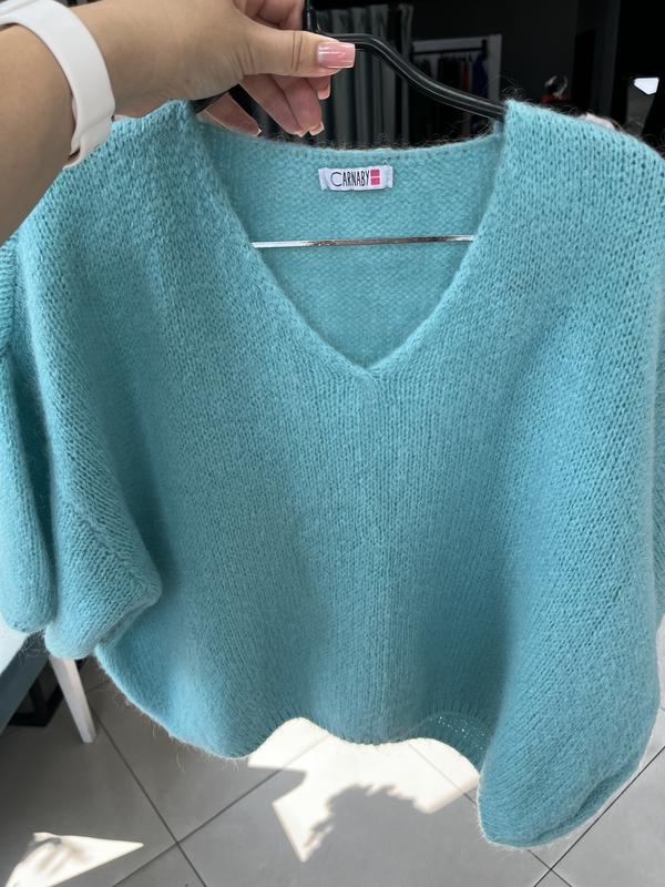 Джемпер в дуже гарному кольорі тіфані. Стан нового, лише без етикетки. Опущена лінія плеча. Рукавчик до ліктьового суглобу.