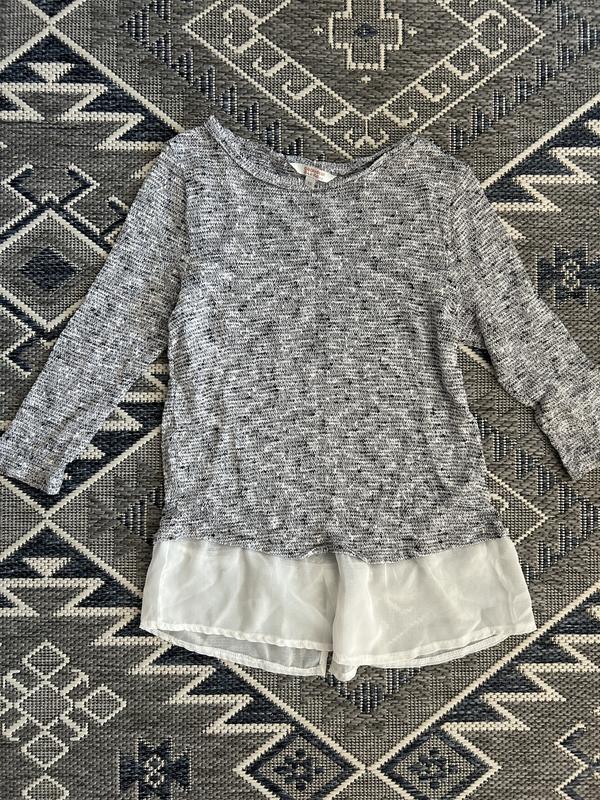 Гарний жіночий джемпер, внизу з імітацією сорочки. Рукав три чверті. Розмір ікс с або с. Колір світло сірий. Дуже гарно виглядає.
