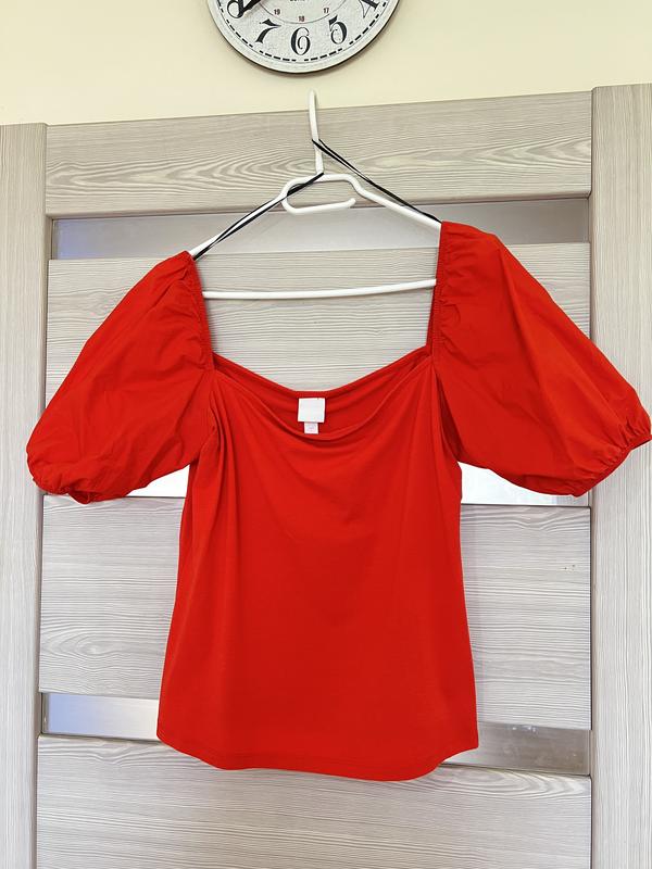 Мокрвяно-червоний топ\блузка фірми H&M розмір М-Л, довжина без рукава 40 см , в грудях 93 см, Рукави ліхтарики можна вдягати на плечі або носити спущені. Довжина від верху рукава до низу 55 см.