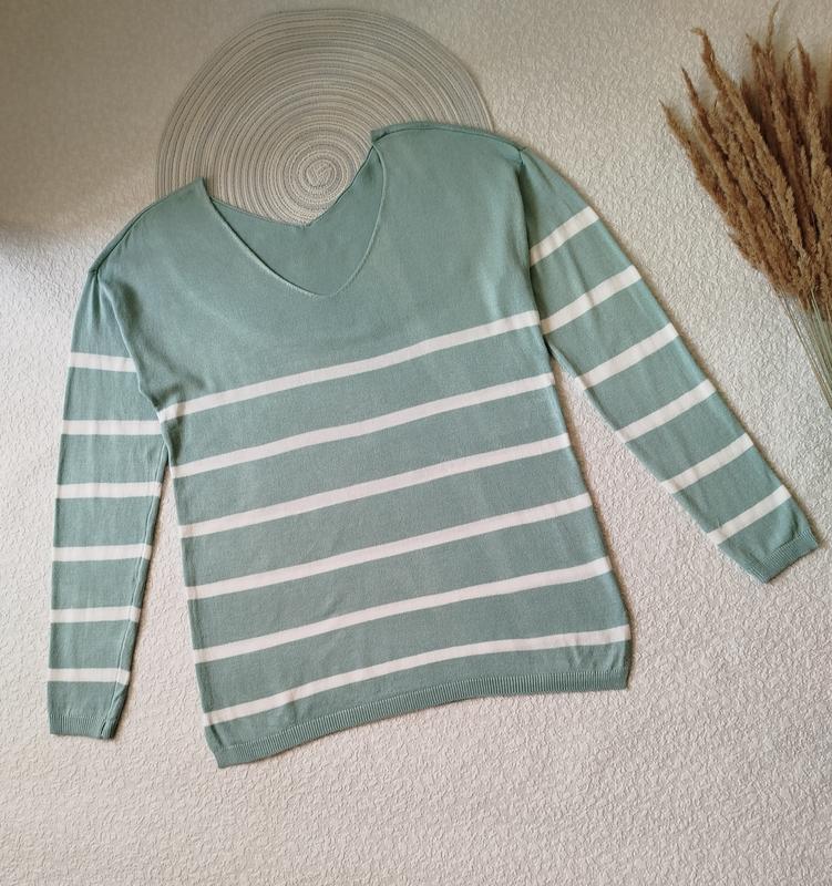 Замечательный женский джемпер из вискозы нежного бирюзового цвета в белую полоску.Ткань легкая,хорошо тянется. Длина 65 Ног 45 Нот 42 Плечи спущены