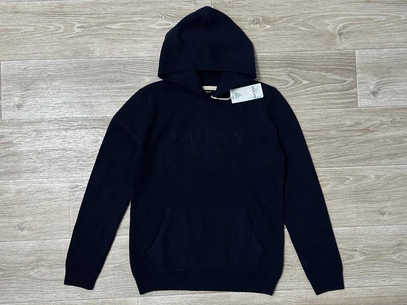 Вязаный джемпер с капюшоном от Guess. M Спереди карма муфта Цвет темносиний В составе есть шерсть и шелк. Новый Размер 14 лет либо xs-s Длина 60. Пог 44. Рукав 59. Плечи 38
