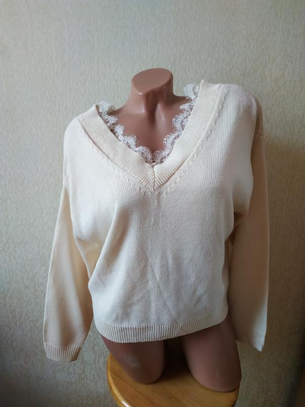 Джемпер світло-бежевого кольору з гарним мереживом. Довжина від плеча 50 см, Пог 54 см, низ 44 см, плечі 53 см, рукав 48 см