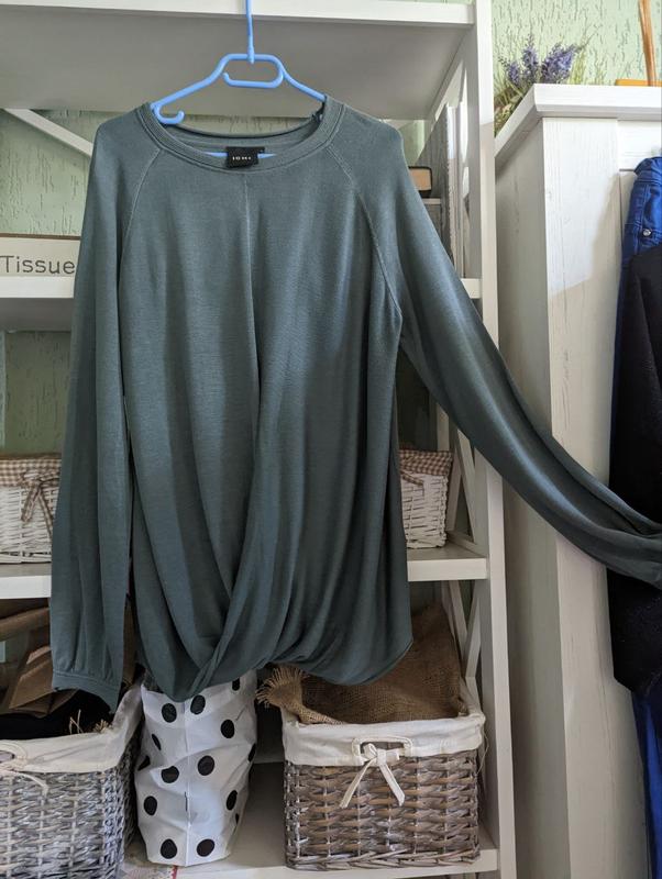 Тонкий джемпер сложного цвета полыни, впереди интересно перекручен, длина-60, полуобхват груди и бедер-54, длина рукава от горловины-77, полуобхват рукава-17, 100% вискоза