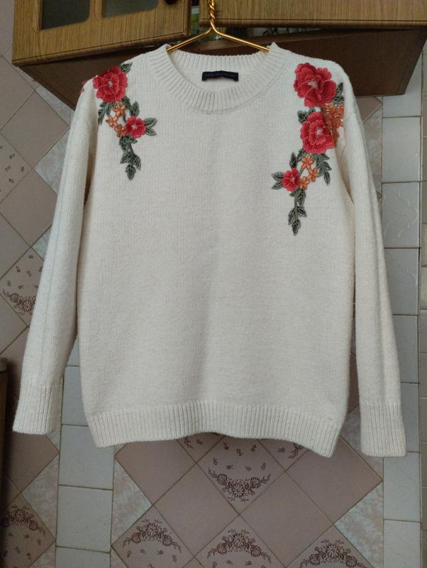 трикотаж щільний, як букле, квіти вишиті і пришити, колір молочний. ПОГ53, довжина 58, рукав від горловини 70, на L ок