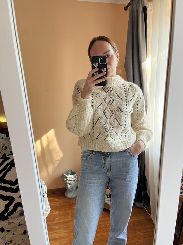 Вʼязаний світер, колючий. Тому краще носити з топом або лонгслівом.