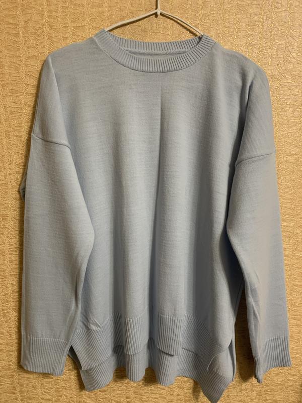 Джемпер ніжного небесного кольору, камера не передала чітко, перід коротший, спинка чуть довша, тканина не щільна, приємна до тіла Заміри: Пог 63 Довжина перід 60, спинка 66 Довжина рукава від шиї 71
