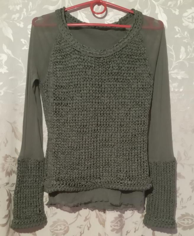 женский зеленый свитер или джемпер с вязаным корпусом и прозрачными рукавами.