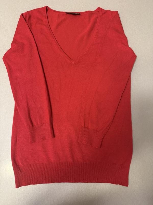 Кофта з рукавом 3/4, дуже приємний на дотик трикотаж - на 82% Віскоза. Довжина виробу 56 см, ширина під руками 40 см. Глибина вирізу може потребувати топу для декольте.