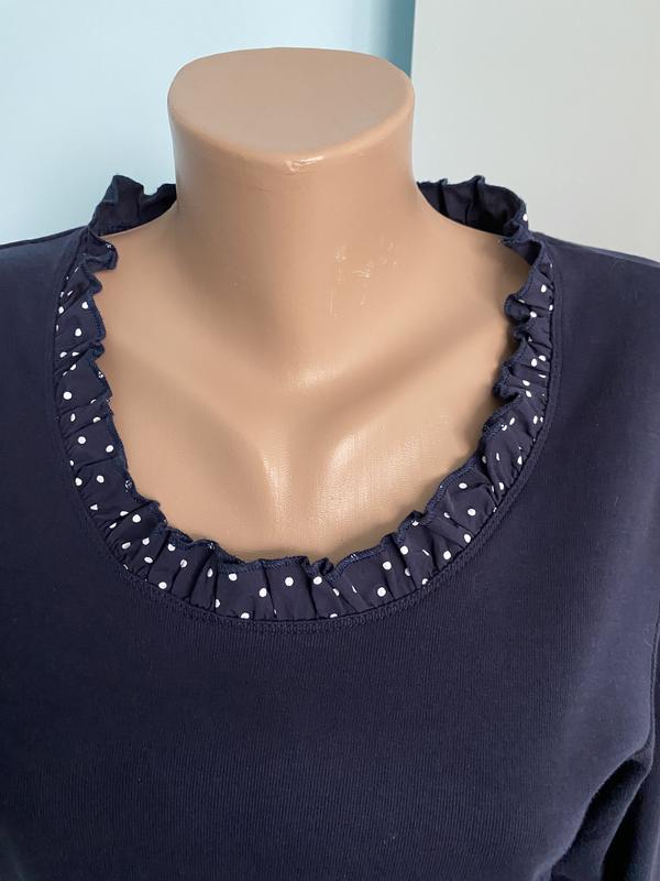 Гарна кофтинка з натуральної тканини, горловина оздоблена тканиною в горошок, рукав 3/4. Дивиться дуже гарно, стан ідеальний. НОГ 53 см, НОТ 45, НОС 53 см, довжина 64 см, довжина рукава 45 см.