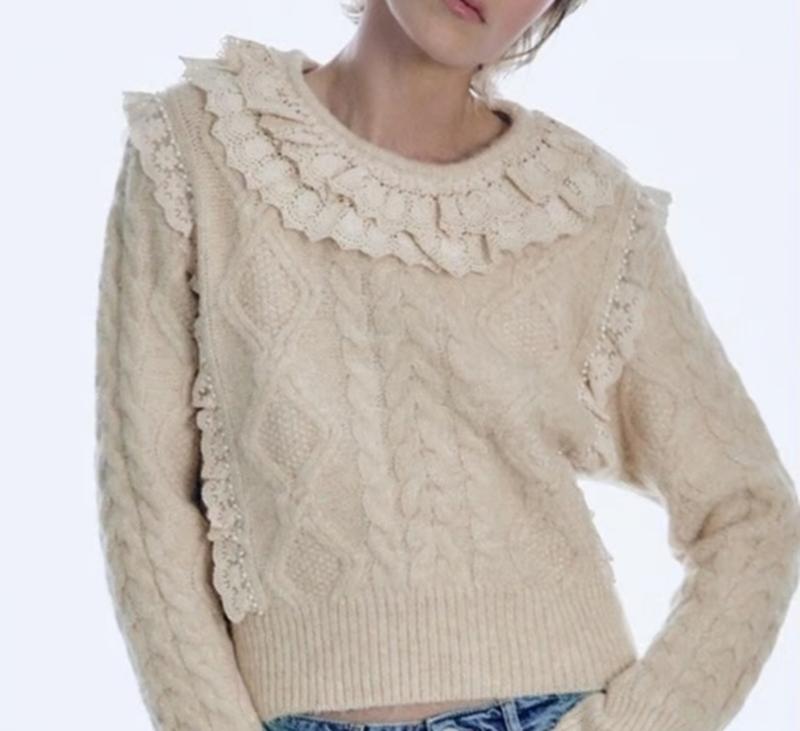 Светло-бееновый джемпер с кружевом и бусунами р.S.грудь 48. плечи 42,рукав 57.длина 52.