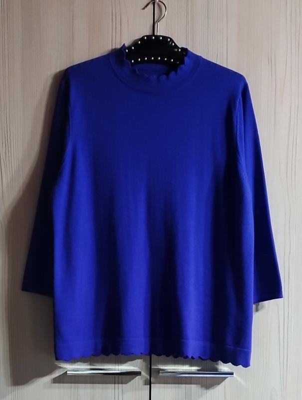 Фиолетовый джемпер (цвет на последнем фото лучше переданы) из 100% шерсти мериноса. Бирка с брендом и размером срезанная. Ориентируйтесь на замеры. Прямой крой, воротник-фигурная стойка и рукава 3/4. Шерсть гладкая, приятная к телу. Размер 16-18 Состав : 100% шерсть мериноса Длина - 69 ПОГ - 57+ Плечи - 43+ Рукав - 49