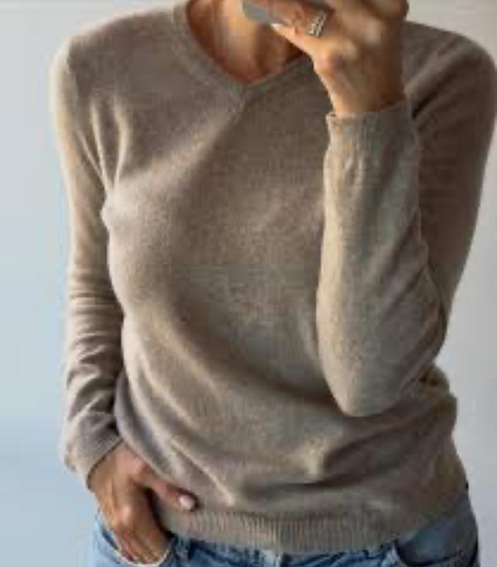 Бежевий кашеміровий светр з V-подібним вирізом — класична модель із м’якого натурального кашеміру. Виміри: ПП 35 ПГ 48 ПТ 46 Низ 43 Довжина 68 Рукав 67