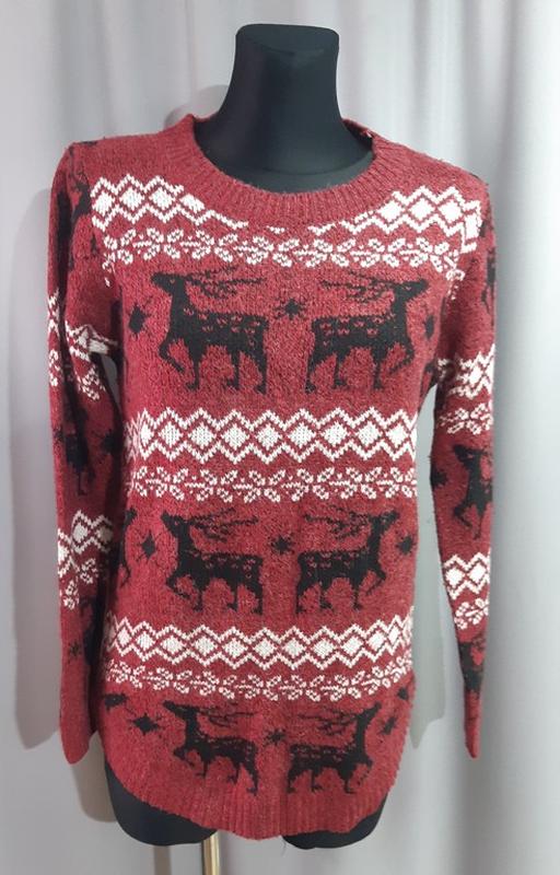 Джемпер женский красный Олени Olko. Размер М. ПОГ-48, Рукав-61, Плечи-40, Длина-71. Новый.
