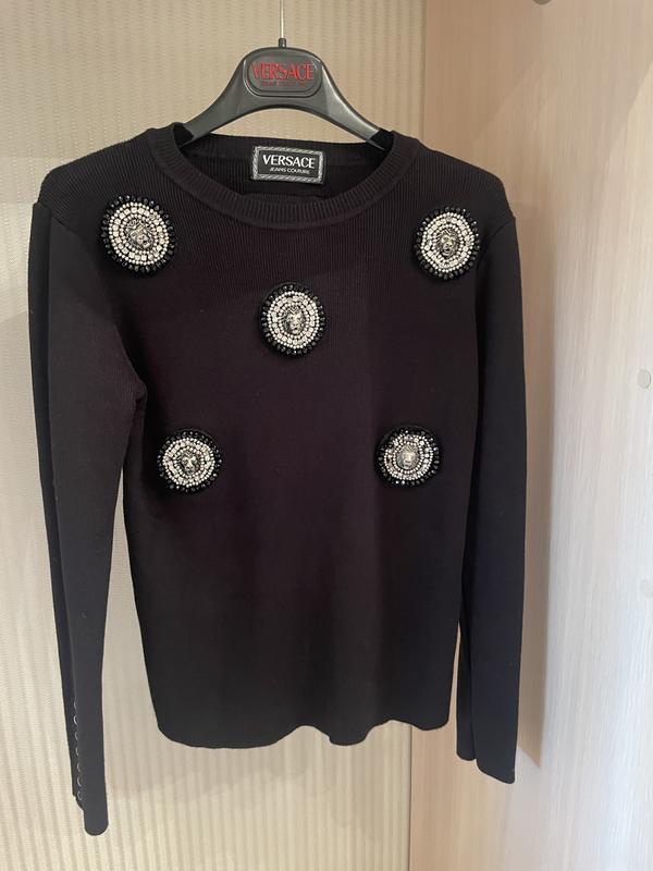 Оригінальний джемпер від італійського дорогого бренду VERSACE JEANS, куплявся в Італії. Розмір: S. Комплект містить також чохол-пильник. Модель виконана з вовни та віскози спереду вишита абріатура голови Льва, що доповнена камінцями та бісером, дуже гарна модель. Відсутні значні ознаки носіння. Ціна символічна.  Заміри: ОГ: 44 cm Довжина: 56 cm Довжина рукавів: 56cm Бедра: 40 cm Відправляю тільки новою поштою за передоплатою на картку суми в розмірі 200₴ примірка тільки на новій пошті! Не відправляю безпечною оплатою. Після примірки на новій пошті поверненню не підлягає!