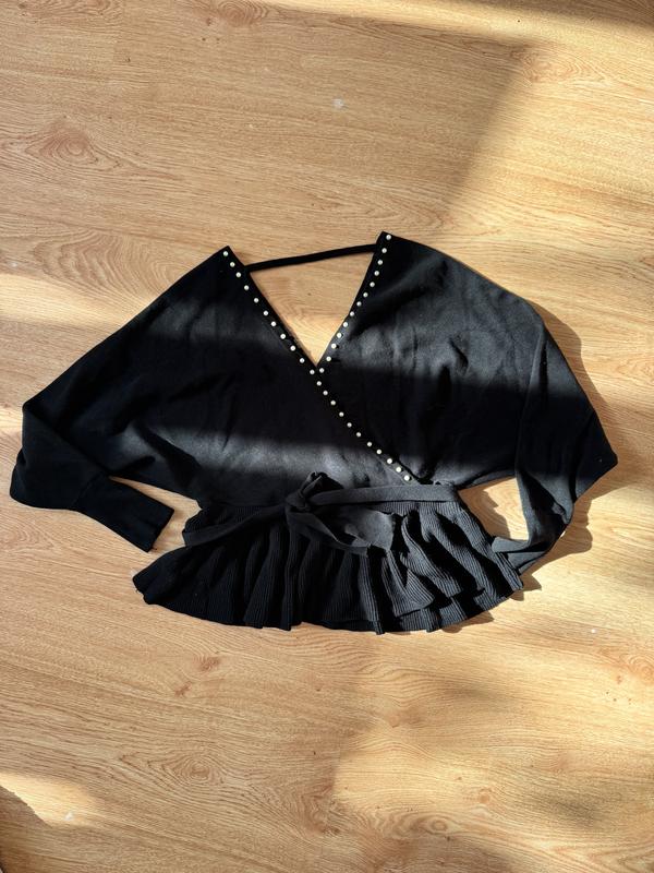 Кофта на запах, чорна з перлинками та поясом. Трикотажна, добре тягнеться, сзаду привідкрита спинка