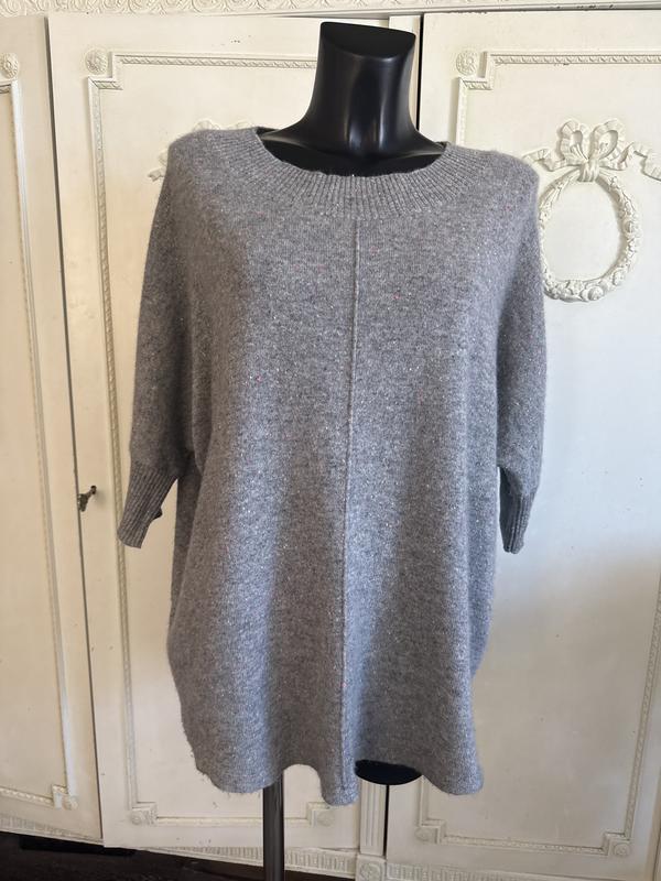Якісний мʼягенький джемпер Оверсайз . Склад:кашемір-100/. Колір сірий меланж(вкраплення рожевого, зеленого, жовтого). Розмір по бірці-38. Заміри: довжина-71 см, ПОГ-66 см, ПОБ-64 см, рукав до локтя. Стан ідеальний.