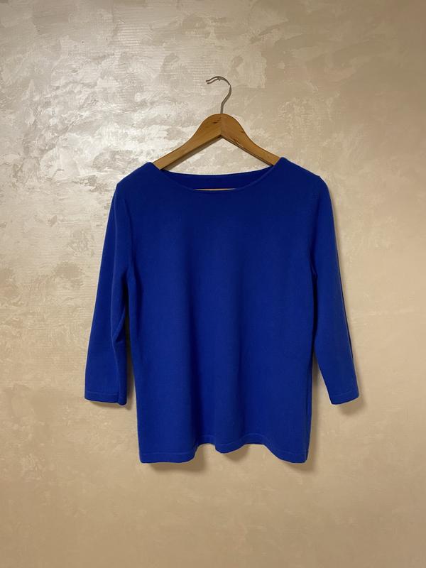 Жіночий джемпер яскраво синього кольору, рукав вкорочений, кашемір середньої щільності. Довжина 60 см. Довжина рукава 46 см. Напів об’єм грудей 52 см. Плечі- 38 см.