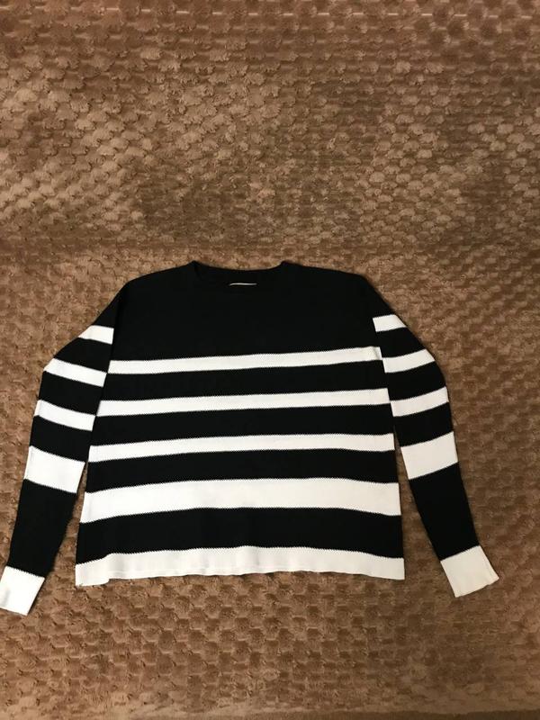 Черный джемпер в белую полоску. Рукава прилегают к рукам, а на теле очень свободная кофтина. Указан размер M, но будет и на S