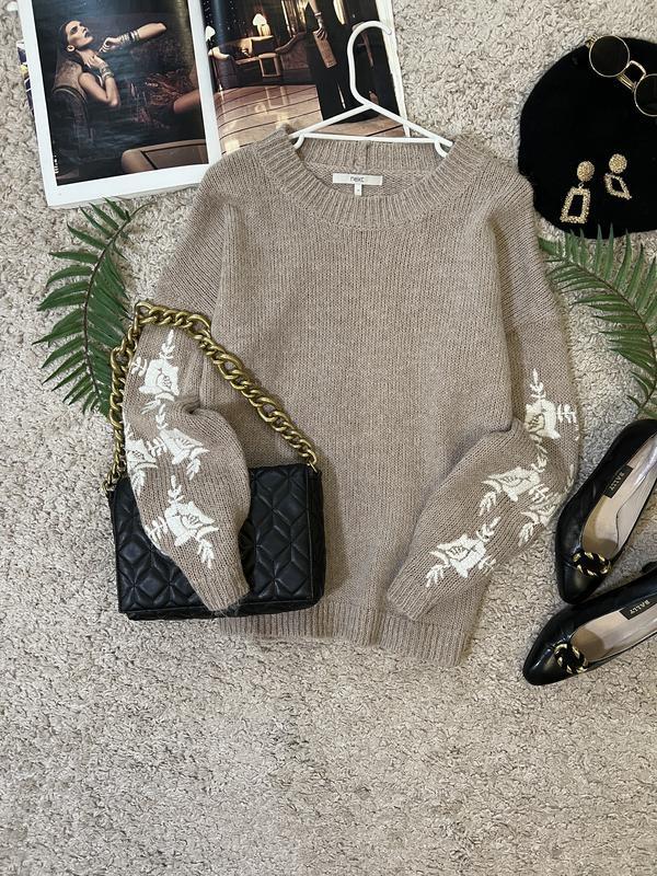 Для більш точного визначення, виміри, порівнюйте із вимірами подібної речі, а не зі своїми обсягами. Об'ємний м'який светр оверсайз з вишивкою. Тканина машина в'язка. Без застібки. Лінія плечей спущена. Рукава декоровані вишивкою. Стан: дуже хороший. Дефекти: ні. Розмір на бирці: 12/40 {Напівобхвати виробу вимірюються по спині, від шва до шва!} Виміри виробу: Плечі 67 см., рукав 48 см., рукав від горловини 75 см., ширина рукава 17 см. Напівобхват грудей 59 см., Напівобхват низ 61 см., довжина від плеча 61 см. довжина по спині 64 см. Склад тканини: 75% акрил, 25% нейлон. Країна виробник: Китай. Бренд: Next. Оплата і доставка: Оплата на картку монобанк. Бронювання на оплату тільки 24г. При змінах наміру купувати обов'язково повідомляйте! Доставка: На час введення воєнного стану уточнюйте чи можлива доставка до Вашого пункту. Актуальні новини можна уточнити на сайті перевізника та за номером телефону контакт-центрів. Не забудьте ПІДПИСАТИСЯ щоб бути в курси всіх новинок та розпродажів