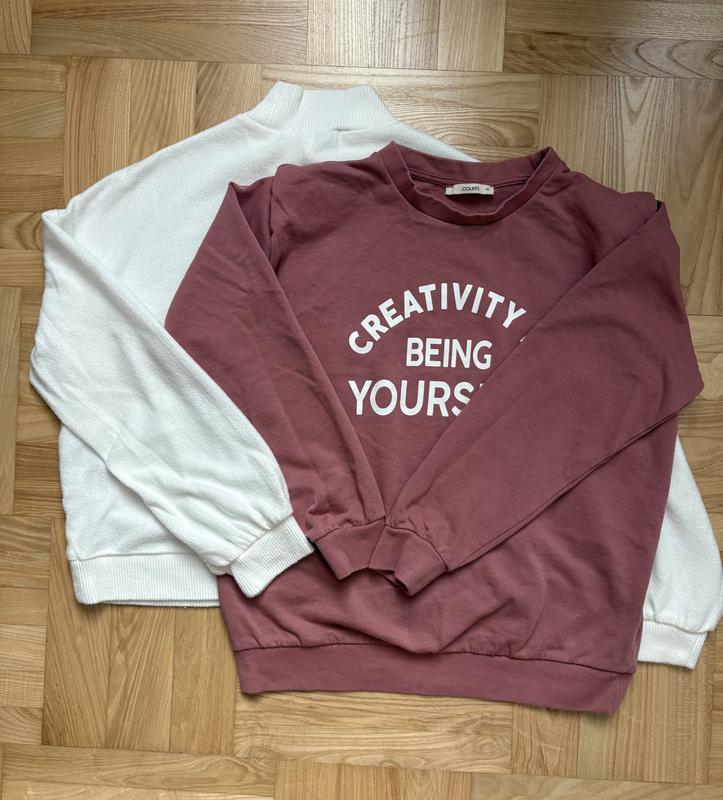 Дві кофтинки Colin’s XS-M 👕 Світшоти (2 шт.) — жіночі, можна і на підлітків Набір із двох зручних і стильних світшотів. 🌸 Кольору пильної троянди — рукав із “плечіком” і защіпом, оригінальний крій, гарно сидить. 🤍 Білий базовий — м’який, приємний до тіла, із приспущеним рукавом; є незначні катишки (видно на фото). Обидва добре тримають форму, комфортні у носінні. 📏 Заміри: 🌸 Пильна троянда Довжина — 60 см ПОГ — 53 см Довжина рукава від плеча — 51 см 🤍 Білий Довжина — 54 см ПОГ — 55 см Довжина рукава від горловини — 71 см