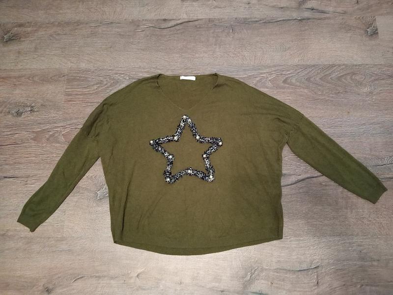 джемпер трикотажный,на размер 50-52, замеры ог 72см (шитый литий мышкой) длина 67см звездочка твидовая с жемчужинами,все элементы на месте,джемпер в идеальном состоянии,цвет в реале темный насыщенный хаки ( фото не передает,бо-спалах цвет на тон засветляет )
