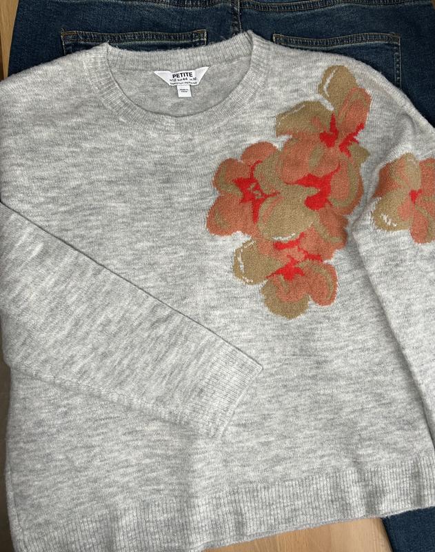 Джемпер кольору сірий меланж з квітковим принтом. Тканина мʼяка, приємна на дотик. Розмір М-L Без нюансів.