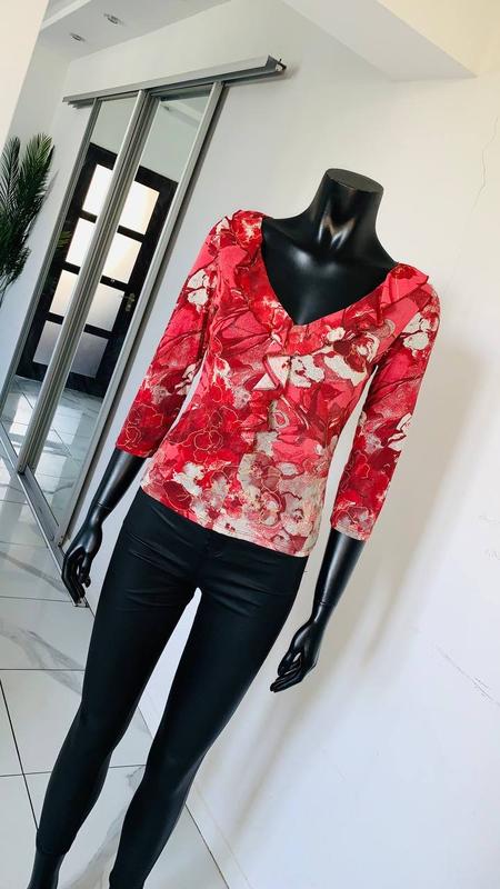 Элегантный женский топ/блузка от Marks & Spencer (M&S) с ярким красно-розовым абстрактно-цветочным принтом (PINK MIX). Модель с V-образным вырезом, декорированным рюшами (воланами) и рукавами 3/4. Характеристики: • Бренд: Marks & Spencer (M&S) • Состав: 100% Полиэстер • Размер UK: 10 • Особенности: Трикотаж, приталенный крой, рукав 3/4. • Цена на ценнике: $15.00 (была $25.00)