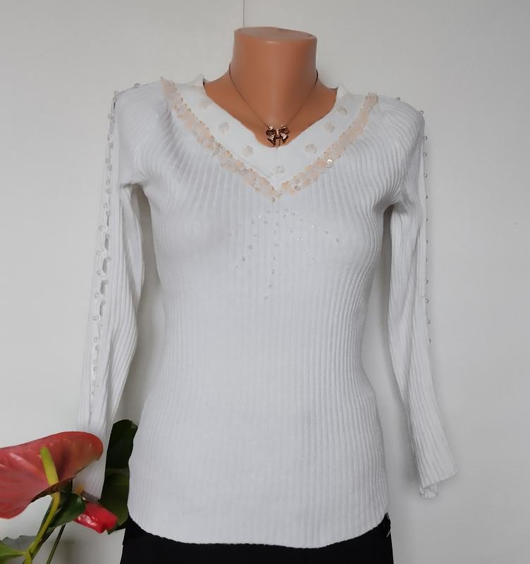 Классный джемпер, украшенный бисером и пайетками, ткань в рубчик. Замеры: длина 56 рукав 52 плечи 30-35 пог 38-58есс 38-58