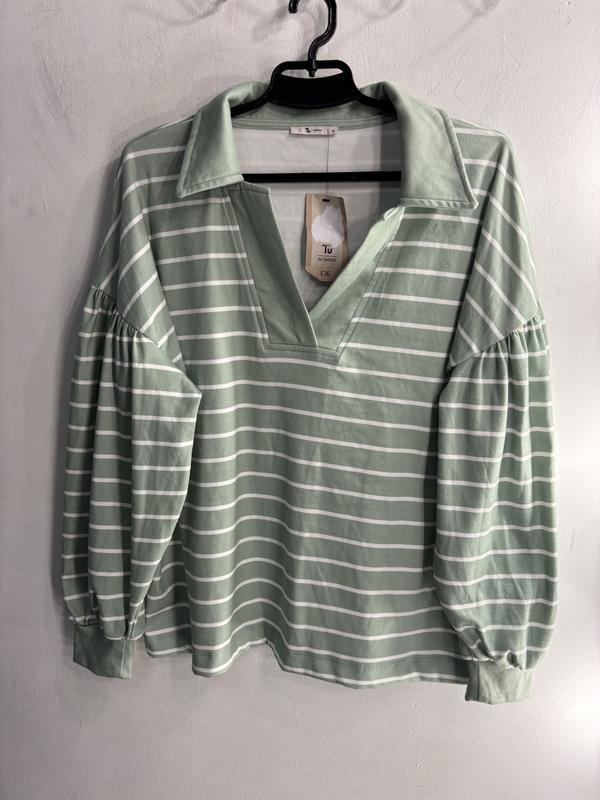 Нова🌷Неймовірно стильна смугаста кофта- джемпер у ніжно-м’ятному відтінку! Ідеальна на кожен день — легка, м’яка та дуже комфортна. Має трендовий комір та V-подібний виріз, що красиво витягує шию. Об’ємні рукави з манжетом додають образу легкості й сучасності. Сядe чудово на будь-яку фігуру й стане вашою улюбленою базовою річчю 💚 Довжина 66 Пог 63+ Понизу 60+ Рукав від горловини 75 Розмір 18