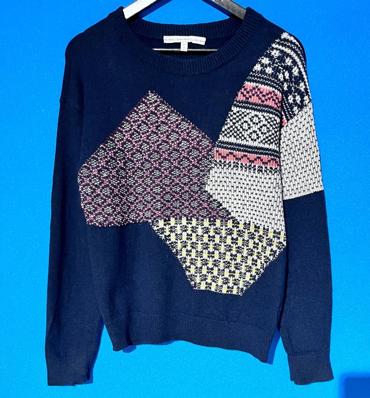 Размер по бирке S. Замеры: плечи 51 см, рукав 56 см, полуобхват груди 49 см, длина по спине 60 см. Синего цвета с круглым вырезом и разноцветными геометрическими вставками. Уникальный стильный дизайн, в стиле пэчворк с использованием различных узоров. 50% шерсть, 50% полиамид