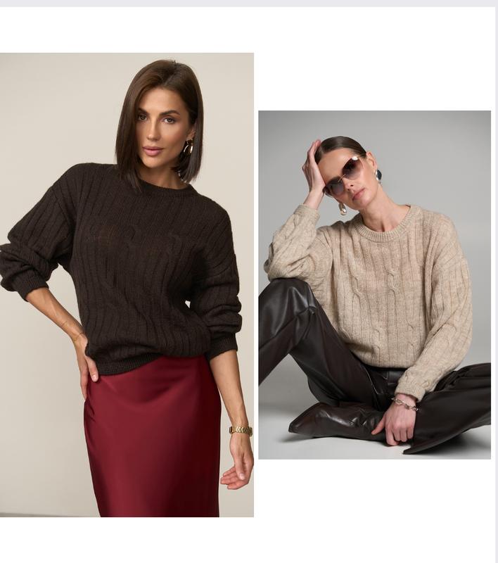 Стильный объемный джемпер из премиальной шерсти. Полупрозрачная, тонкая, фактурная вязка с элегантным узором «косы». Спущенная линия плеча создает непринужденный силуэт. Манжеты рукавов и низ изделия оформлены фиксирующей резинкой. Длина 60 - 64 см (+- 2 см). Ширина в спокойном нерастянутом состоянии 54 - 58 см., в растянутом состоянии 60 - 64 см. Довжина рукава 49 см + ширина плеча 19 - 22 см. Состав и уход 60% - ВОЛНА-МЕРИНОСА 15% - ВОВНА-АЛЬПАКА 10% - МОХЕР 15% - ПОЛИАМИД