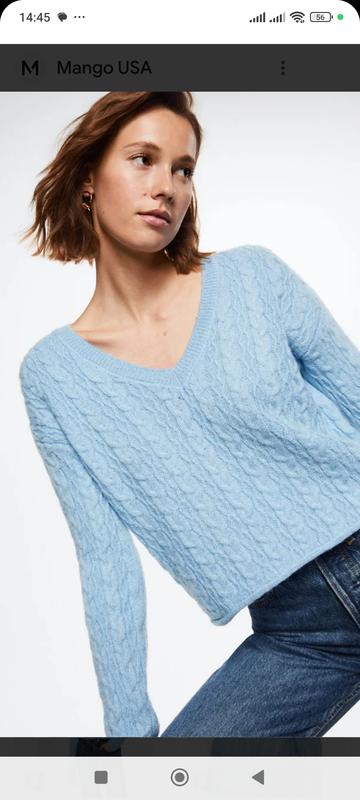 джемпер, голубого цвета (жаль, камера не передает точно цвет. Самое точное первое фото), с небольшими вкраплениями люрекса. Без резинки по низу, і по рукавам. Смотрится очень стильно. Длина 51см, ПОГ 53см, рукав 52см, плечо 16.5см, глубина выреза 15см.