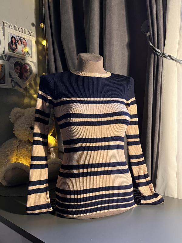 Приталенный джемпер с длинным рукавом и круглым вырезом горловины. Выполнен из эластичного рубчатого трикотажа, хорошо тянется и комфортно сидит по фигуре. Мягкий и приятный на ощупь. Классический дизайн в горизонтальную полоску. Подойдет для повседневной носки, учебы или прогулок. Цвет: бежевый / темно-синий Состояние: отличный Замеры (ориентировочные): • Плечи - 36 см • Полуобхват груди - 38 см • Длина рукава - 58 см • Длина изделия - 58 см (тканина тягнеться) Размер: XS–S (ориентируйтесь на замеры)