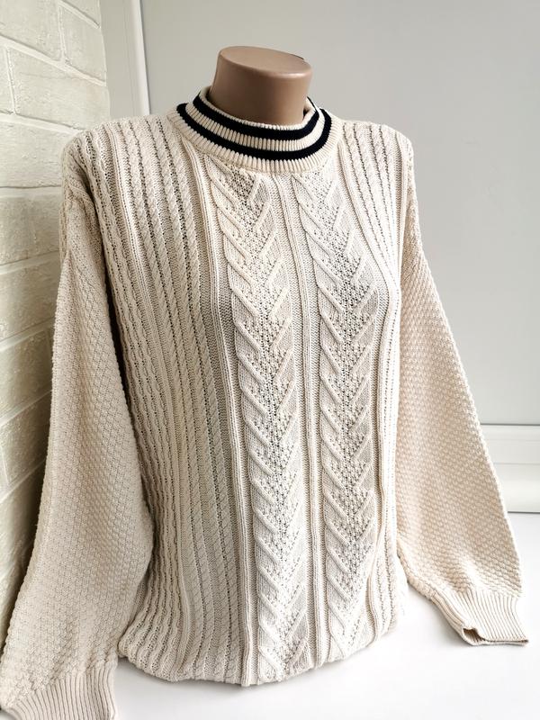 Красивый женский джемпер из хлопка Richard. Мягкое, не тонкое , качественное полотно. Джемпер молочного цвета. Выполнен разными рисунками трикотажного полотна. Прямой силуэт, длинный рукав, круглая горловина с широкой планкой, по низам резинки. Джемпер комфортный и удобный для повседневной носки. Состояние отличное. Дефектов нет. Надет Учтено в цене. Замеры по изделию : ПОГ 64 см, ширина плеча 21 см (спущенное), ДР 53 см, длина по спинке 72 см Фасон оверсайз. Соответствует размерам 48-52. Состав : 100% хлопок (бирка) Производитель Richard Полная предоплата на карту Отправка НП или УП